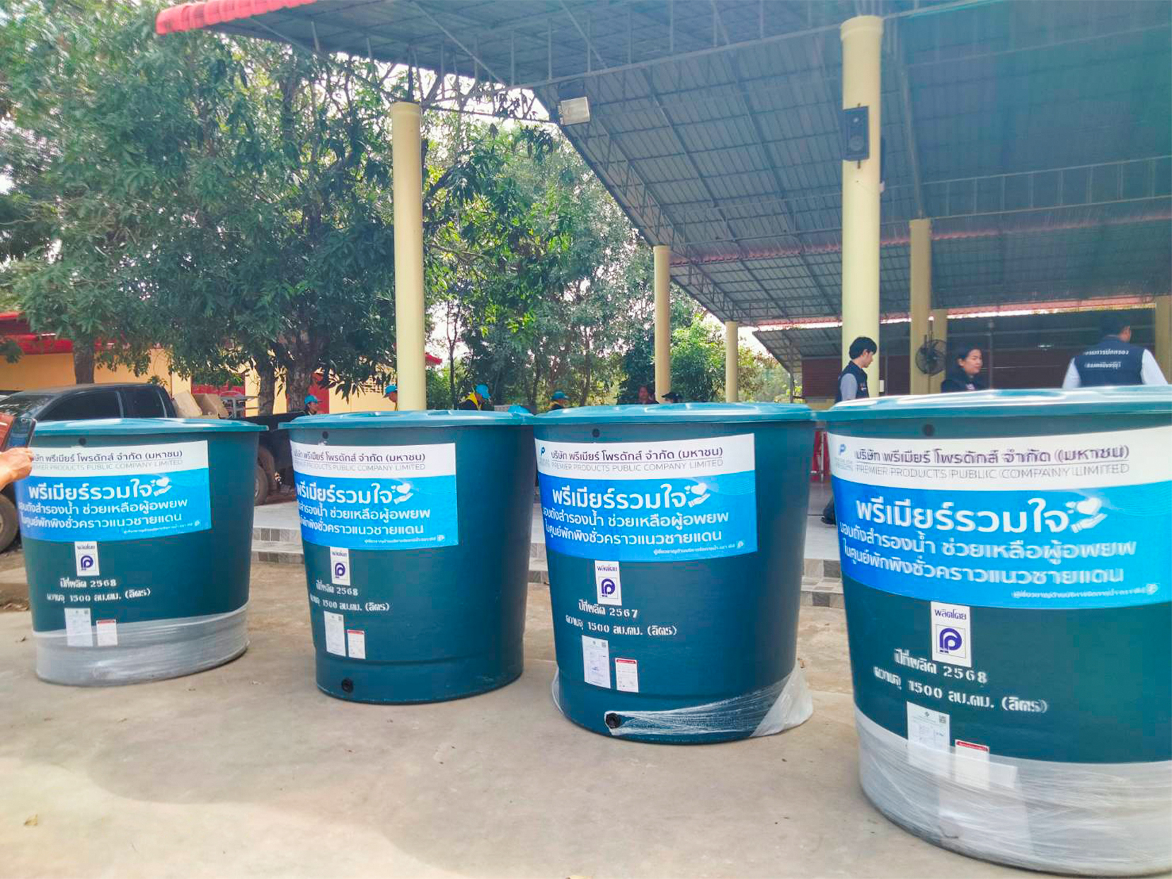 เมื่อวันที่ 11 ธันวาคม 2568 บริษัท พรีเมียร์ โพรดักส์ จำกัด (มหาชน) ได้ส่งมอบถังสำรองน้ำไฟเบอร์กลาสรุ่น คิงโปร ขนาด 1,500 ลิตร จำนวนรวม 6 ใบ ให้แก่ศูนย์พักพิงผู้อพยพ 2 แห่ง ในจังหวัดปราจีนบุรี สำหรับการสำรองน้ำไว้ใช้อุปโภค-บริโภค เพื่อร่วมเป็นส่วนหนึ่งในการบรรเทาความเดือดร้อนจากสถานการณ์ชายแดนไทย-กัมพูชา