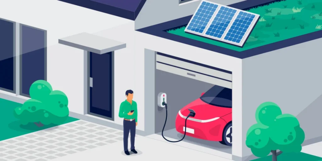 ซึ่งในการชาร์จไฟรถ EV จะต้องมีเครื่องชาร์จ โดยเครื่องชาร์จ EV เปรียบเสมือนเครื่องใช้ไฟฟ้าในบ้าน เมื่อมีแดดระบบโซล่าเซลล์จะผลิตไฟฟ้าไปที่ตู้ MBB (ตู้ไฟฟ้าในบ้าน) จากนั้นตู้ไฟฟ้าจะส่งไฟมาที่เครื่องชาร์จ EV ให้ผู้ใช้งานสามารถชาร์จรถได้เลย